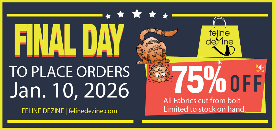 You’ll find a nice selection of novelty cat fabric, basic fabrics, Asian cat fabric, retired fabrics, holiday and seasonal cat fabric, fat quarters and remnants for the quilter and cat toy seamstress. And if you can’t find what you’re looking for, call or send me an email and I’ll be happy to do some checking with my resources.